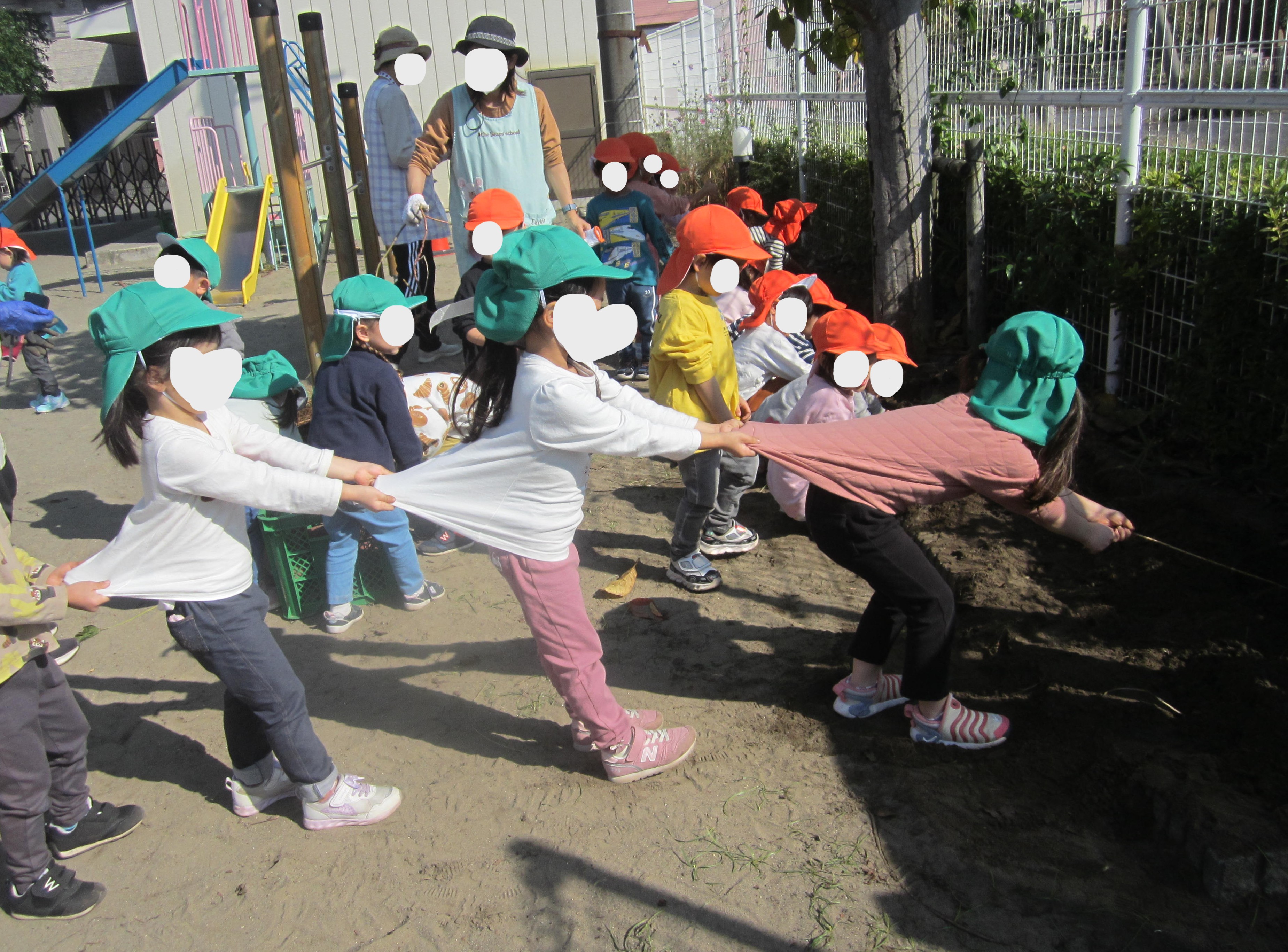【3歳児】芋掘り 2025-10-29 10:13 5月に園庭の畑に自分たちで苗を植え、戸外遊びのたびに「お芋見に行こう!」と楽しみにしていた年少さん 「お芋あるかなぁ?」と一生懸命掘っていました 丸くて大きいお芋を見つけ大喜び なかなか抜けない時は「うんとこしょ♪どっこいしょ♪」とかけ声をかけ、お友だちと力を合わせて頑張る姿も見られました ”おおきなかぶ”の絵本みたいですね